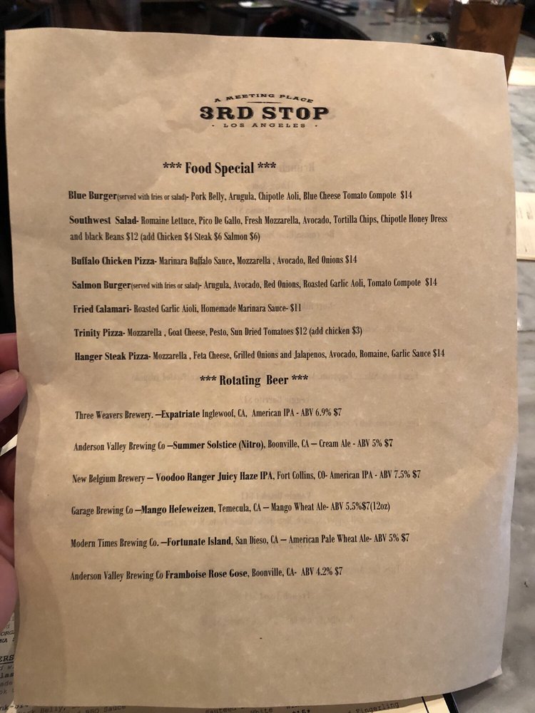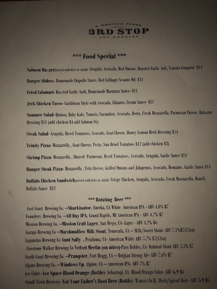 Introducing The 3rd Stop, a renowned gastropub in Los Angeles offering a diverse menu of New American cuisine with a focus on delectable burgers. With a range of amenities like takeout, vegan options, and wheelchair accessibility, this spot caters to various preferences. The welcoming atmosphere is perfect for group gatherings or a casual night out. Standout dishes include the HANGER STEAK SALAD and flavorful TRUFFLE burger, complemented by a selection of craft beers. Customers rave about the friendly staff and generous portion sizes, making it a go-to spot for happy hour or a satisfying meal. Be sure to try the fresh pizzas from the pizza oven and explore the extensive beer selection. For a relaxed dining experience with quality food and drinks, make The 3rd Stop your next culinary destination on 3rd Street.